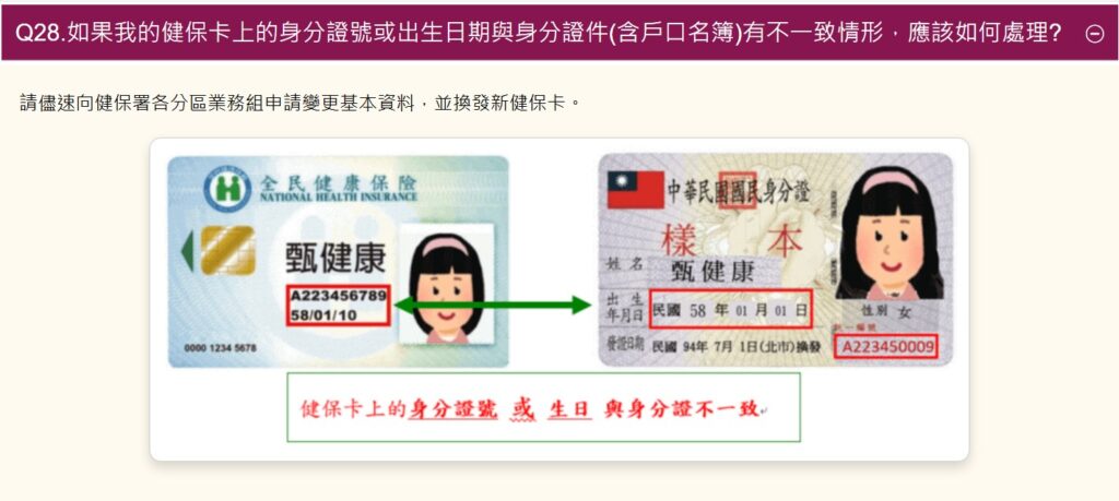 Q28.如果我的健保卡上的身分證號或出生日期與身分證件(含戶口名簿)有不一致情形,應該如何處理?